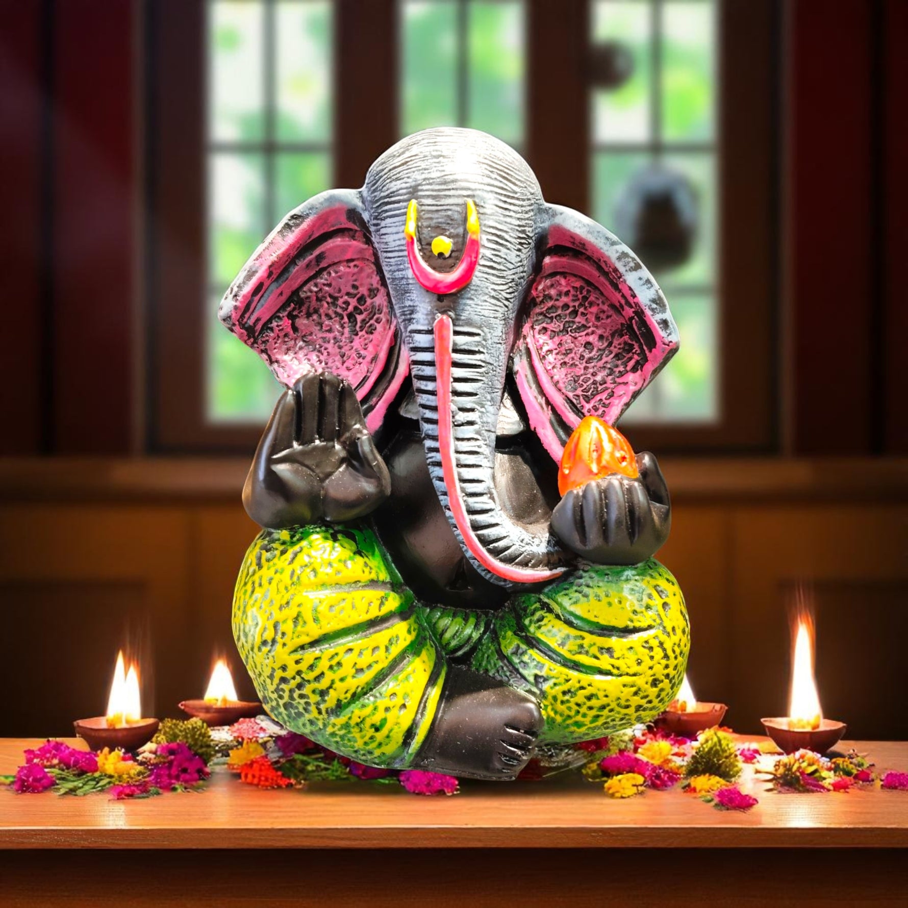 ये कोई साधारण मूर्ति नहीं है — ये Ganesha ji का एक contemporary स्वरूप है जो tradition को modern grace के साथ blend करता है। Jet black texture, vibrant pink detailing और bright green dhoti में Ganpati Bappa एकदम stylish देवता जैसे प्रतीत होते हैं।